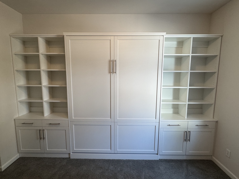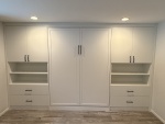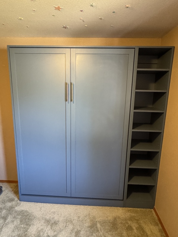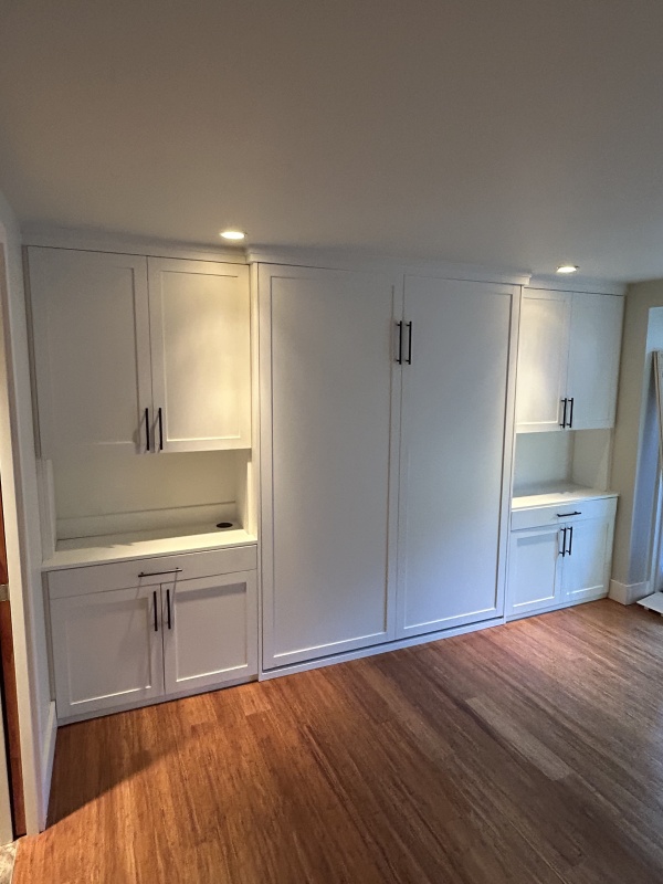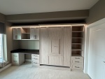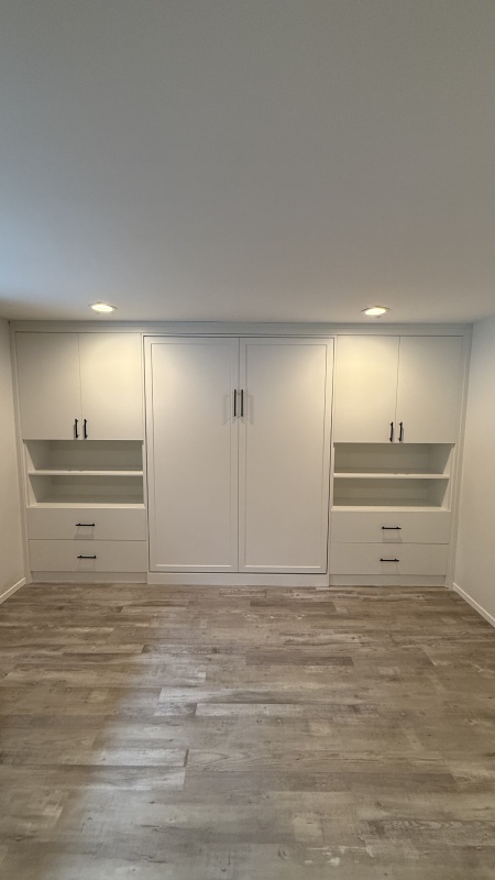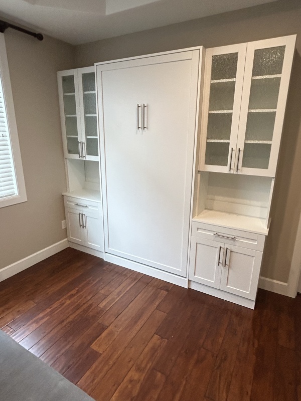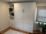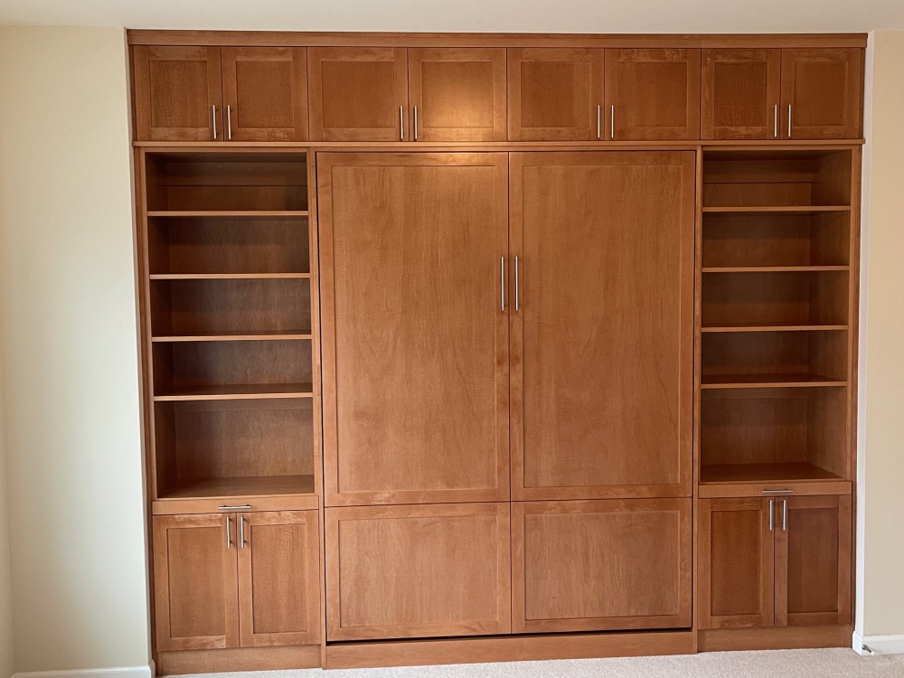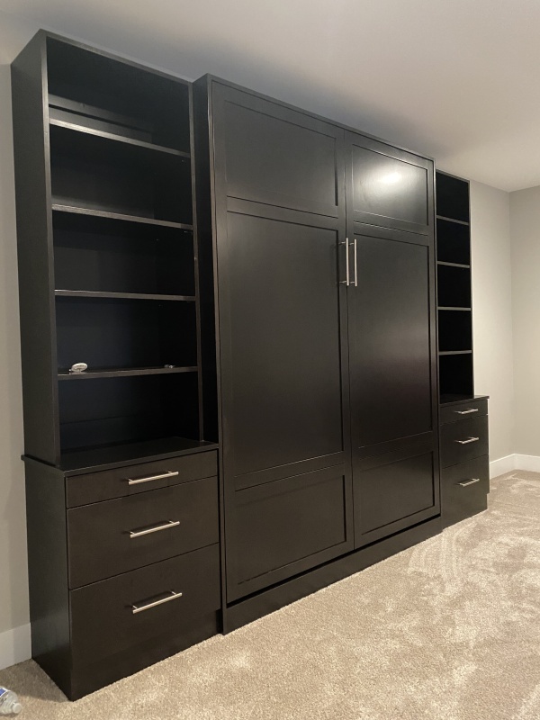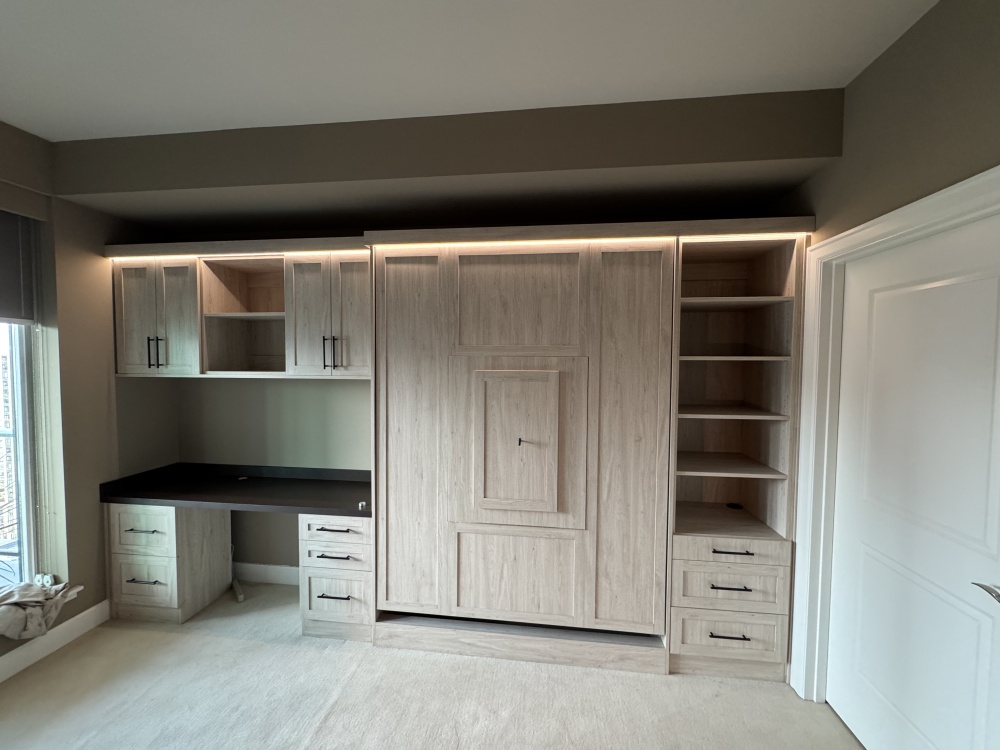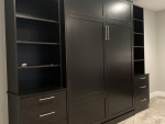 Working with our designers, you will be able to create a decorative bed face that is both functional and unsuspecting of what lies behind; what might look like a free-standing armoire cabinet actually folds into a Murphy bed! Our Murphy beds are available in premium quality melamine or real wood in clear, painted, or stained finishes!